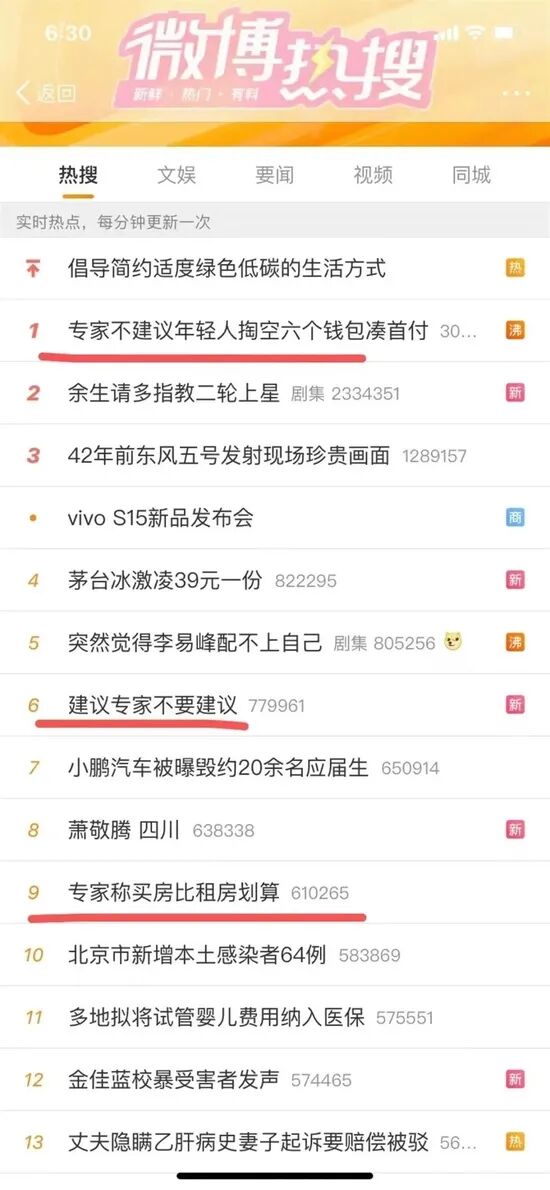 为什么“专家不建议年轻人掏空六个钱包凑首付”“专家称买房比租房划算”这样的建议能登上微博热搜?