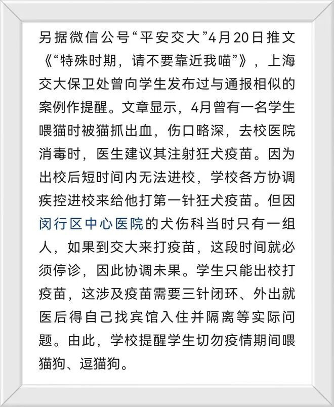 上海交大想得有点长远,万一你被猫咬了呢?你被猫咬了就要去医院,去医院就是给防疫添麻烦。八个字,欲加之罪,何患无辞。
