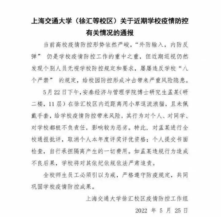 前两天网传“上海交通大学关于近期学校疫情防控有关情况的通报”的截图显示,安泰经济与管理学院博土研究生孟某,因近距离用小草逗流浪猫,且没有戴手套,取消本年度评优资格,须做书面检查,且自行承担隔离费用。