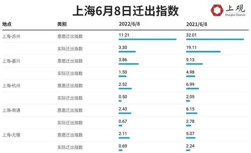 从高德地图迁徙数据看,与去年同期相比,无论是意愿迁出还是实际迁出指数,上海到周边二线城市发展的人数都有所降低。