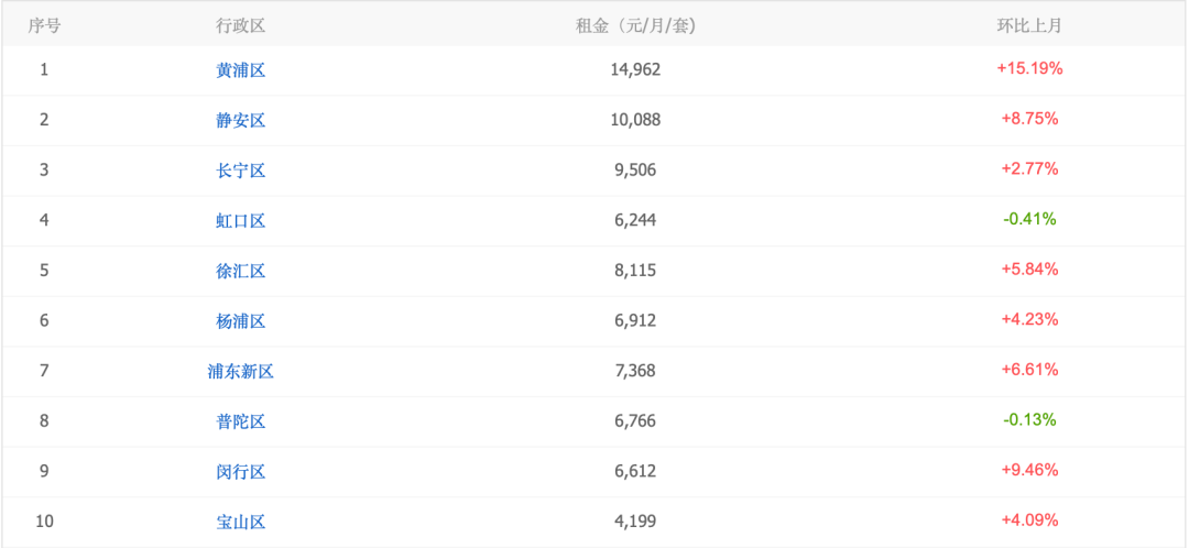这和上面提到的房租环比上涨情况基本保持一致。租房热度最高的几个区域,租金环比上涨幅度也是最高。如黄浦(15.19%)、闵行(9.46%)、浦东新区(6.61%)。