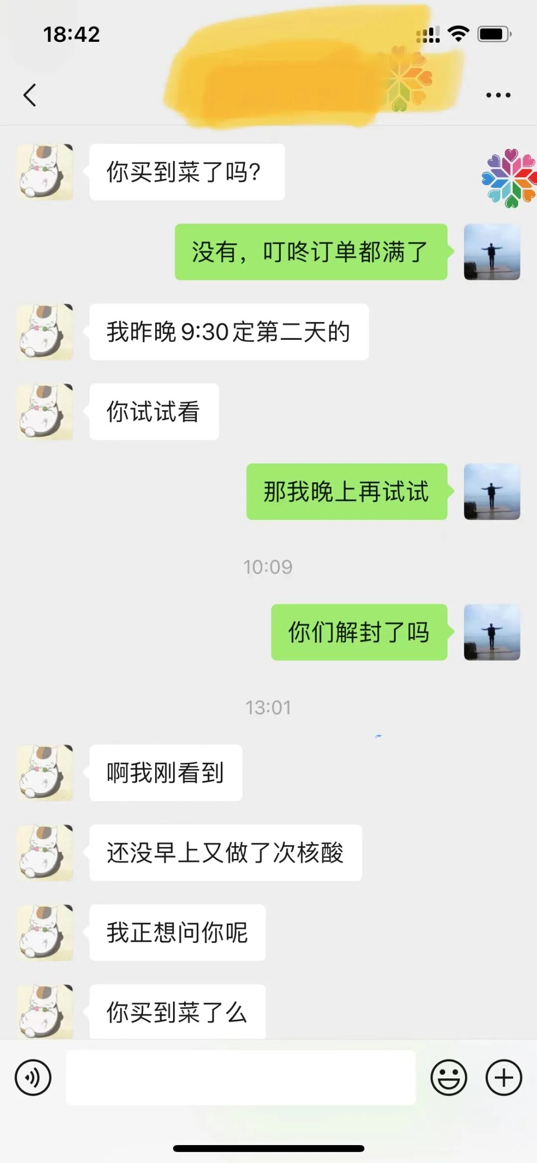 后来我再问她有没有买到菜,她说熬夜到12点下单晚了,平台说早上6点可以购买,于是又定了闹钟,清晨6点爬起来才抢到了菜。