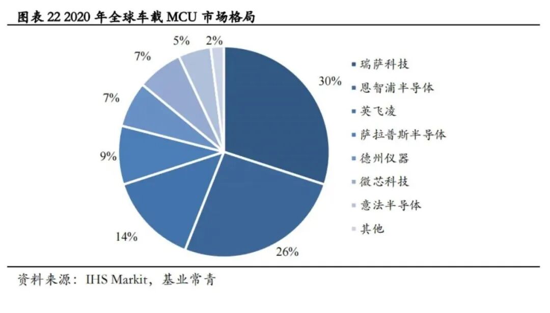 来自IHS的数据显示,在汽车MCU的供应中,瑞萨半导体占到了30%,全球前七大供应商,瑞萨、恩智浦、英飞凌、赛普拉斯(已被英飞凌收购)、德州仪器、微芯、意法半导体,共占据98%的市场份额。
