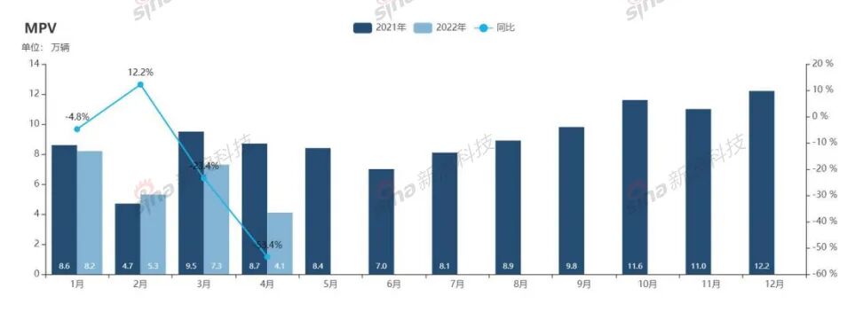 在有数据可查的36款在售MPV产品中,2021年,有15款的销量出现了下滑,导致整体市场萎靡——这15款产品的平均下滑幅度达到了50.5%。