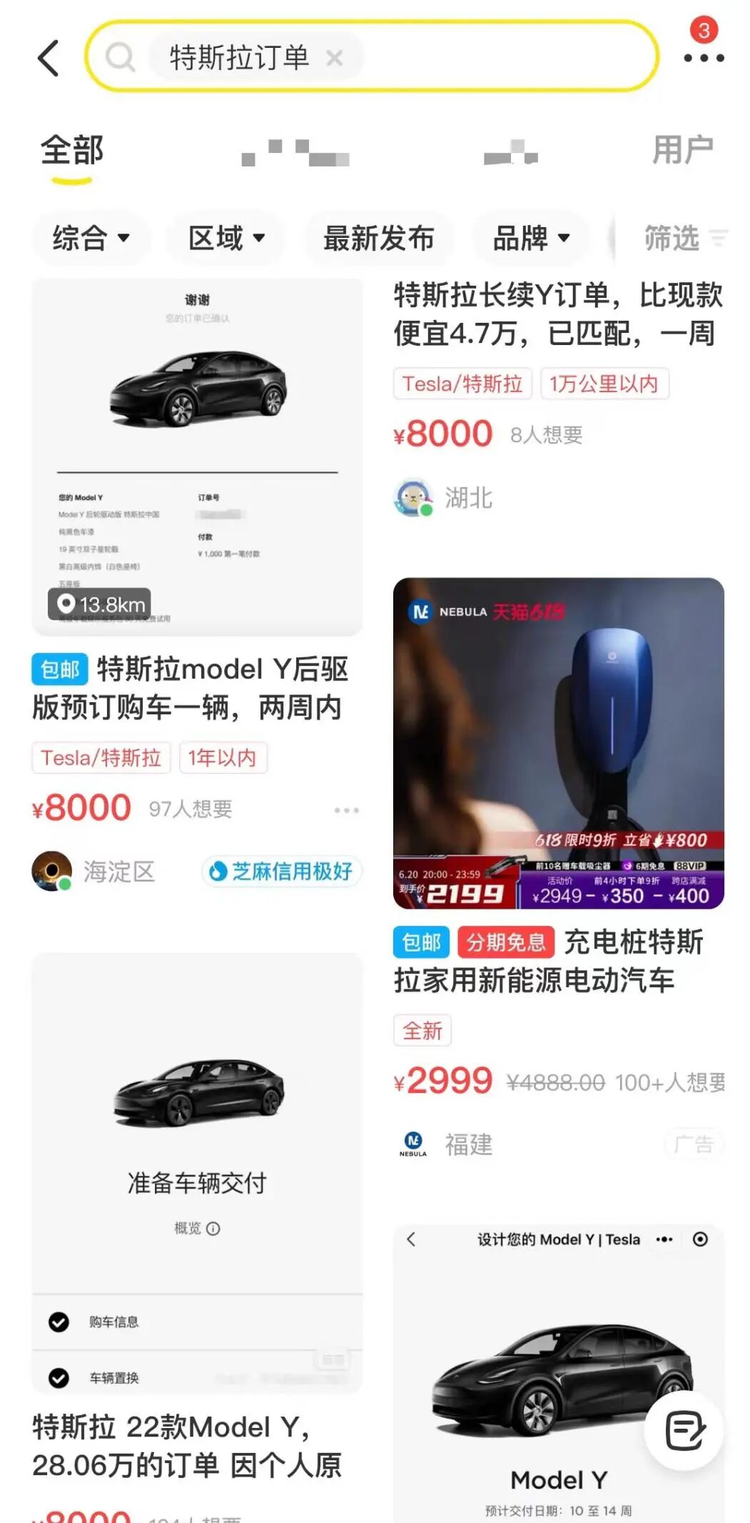 但在有利可图的情况下,不少人也不会在乎这样的风险。《次世代车研所》在某二手平台上发现,不少人均愿意出售自己的特斯拉订单,主要集中在Model Y长续航版,价格均在8000元以上;也有用户愿意出价5000-6000元求购特斯拉订单。
