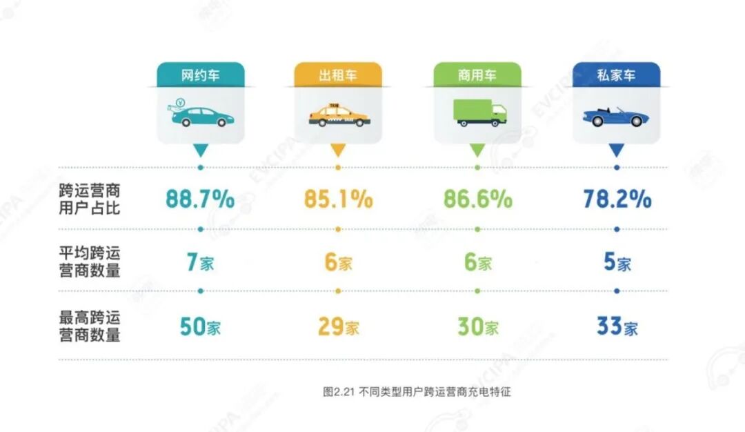 《白皮书》显示,19.9%用户有跨城充电行为,平均跨城3个。超过80%的新能源车主为跨运营商充电用户,且平均跨运营商数量约为6家,最高的甚至能达到50家,这样的极端情况主要出现在网约车司机群体中。此外,更有超过95%的车主有跨站充电行为,平均跨站16座,最多的甚至达到160座,这意味着很多车主都有随时随地充电的需求。