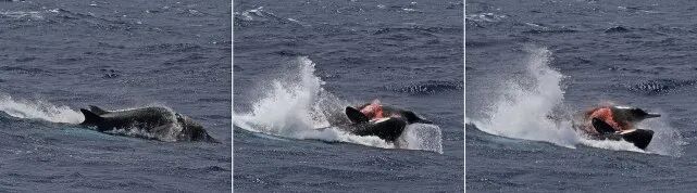 若是捕食鲸鱼,虎鲸也只对体型较小的小鲸鱼下手,也是分为几组,有的用来吸引鲸鱼妈妈的注意力,有的用身体将鲸鱼母子隔开,有的则专心攻击小鲸鱼,通力合作下,小鲸鱼很容易因为溺水死亡,虎鲸则成功饱餐一顿。