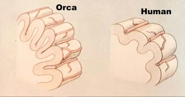 大脑皮层褶皱指数,人类是2.2,宽吻海豚是5.67,而虎鲸 是5.7,可以说虎鲸大脑的折叠量和褶皱量是最多的;