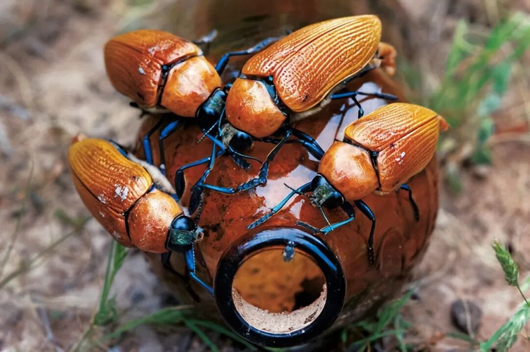 不出所料,30分钟后两个酒瓶总共吸引到了6只雄性甲虫,其中一个酒瓶上甚至爬了5只。