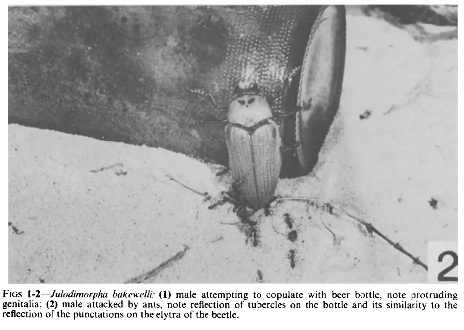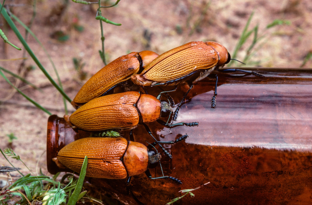 这对夫妇观察到,许多雄性宝石甲虫在飞行后并没有冲着雌性着陆,而是向着啤酒瓶,它们爬上啤酒瓶就像爬上雌性甲虫的背上一样。