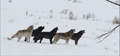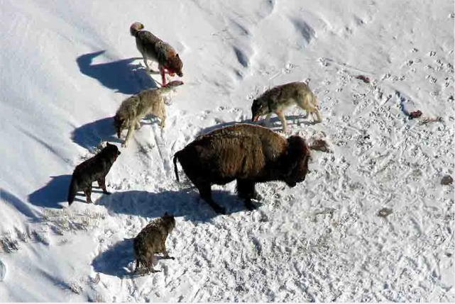 猎物一旦停下来,狼群四面八方撕扯猎物,最终猎物卒,狼群大快朵颐。