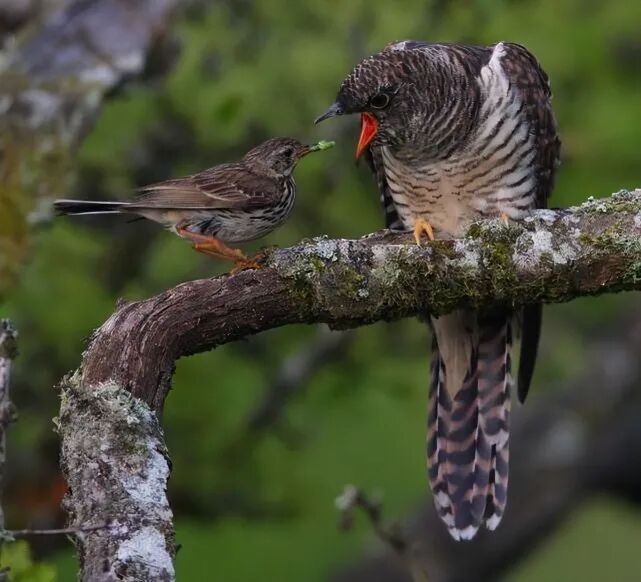 而且它们选择的宿主基本都是那些体型较小的鸟,所以当杜鹃鸟的雏鸟逐渐长大的时候,就会出现体型很小的鸟妈妈辛苦喂养着一只“巨婴”杜鹃鸟的超级反差现象。