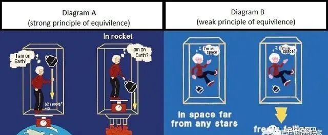 上图:强等效原理(左),即引力效应与加速运动等效;弱等效原理(右),