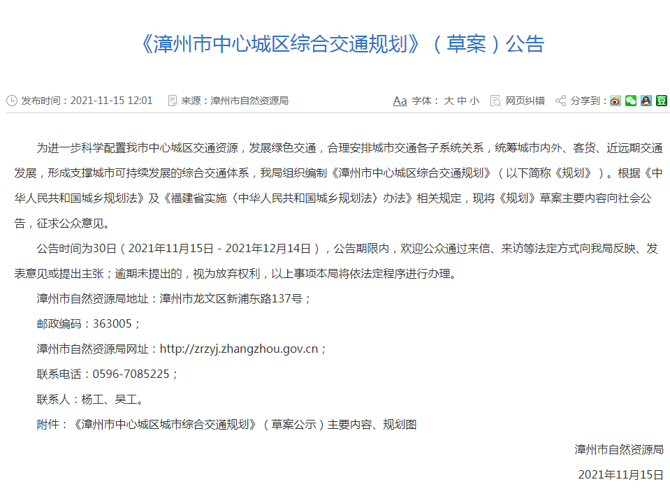 近日,官方网站发布《漳州市中心城区综合交通规划》(草案)公告。这是漳州撤县设区后,首次释放出的重磅规划消息!