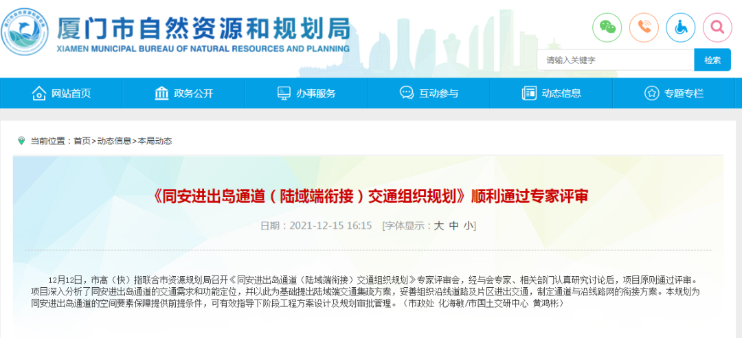 近日,市高(快)指联合市资源规划局召开《同安进出岛通道(陆域端衔接)交通组织规划》专家评审会,项目原则通过评审。
