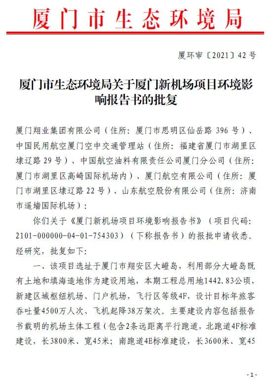 就在昨天,厦门市生态环境局批复关于厦门新机场项目环境影响报告书。