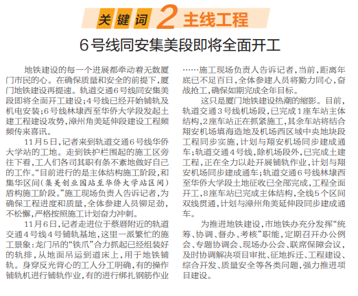 轨道交通6号线同安集美段即将全面开工建设;4号线已经开始铺轨及 机电安装;6号线林埭西至华侨大学段发起土建工程建设攻势,漳州角美延伸段建设工程频 频传来喜讯。