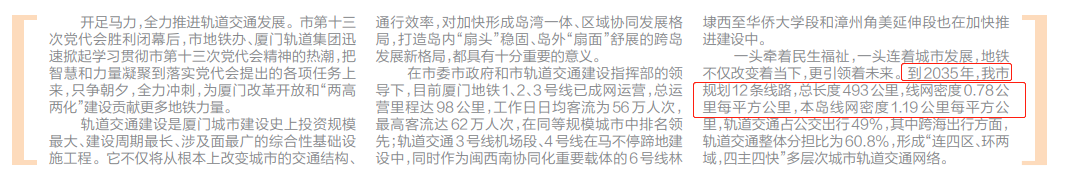根据厦门日报报道,目前厦门地铁 1、2、3 号线已成网运营,总运营里程达98 公里,工作日日均客流为56万人次, 最高客流达62万人次,在同等规模城市中排名领先;轨道交通3号线机场段、4号线在马不停蹄地建设中,同时作为闽西南协同化重要载体的6号线林 埭西至华侨大学段和漳州角美延伸段也在加快推进建设中。