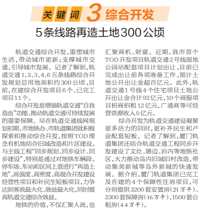 轨道交通1、2、3、4、6五条线路综合开 发规划总用地面积约300公顷,目前在建综合开发项目6个、已完工项目11个。