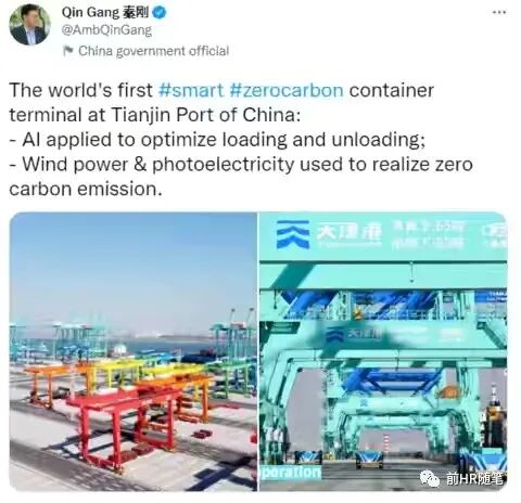 在10 月 17 日,在天津港北疆港区 C 段码头七彩廊道前,举办了天津港第二集装箱码头有限公司暨全球首个智慧零碳码头正式投产运营仪式。该码头的智能水平运输系统由天津港集团联合华为、中国移动等公司打造。这个港最大特点就是AI+5G+无人自动化驾驶+0碳能源管理,刚好这些领域都是华为的强项。我当上看到秦大使的贴,感觉这个先进码头估计只有华为才搞得这么好和快,一查还真是这样。