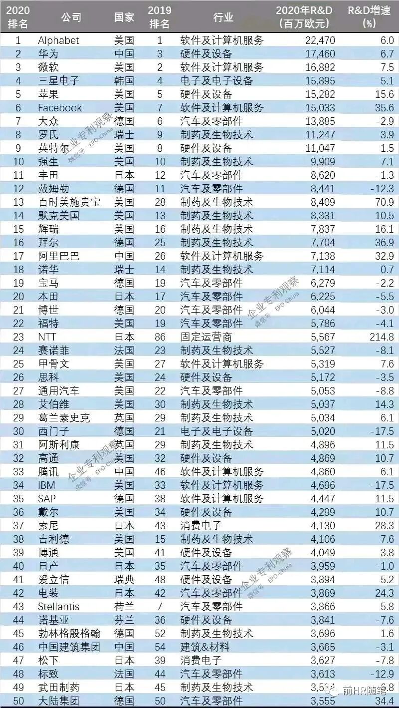 这两个清单令人高兴的是,图1的专利排行榜前十除了华为外,还有京东方、腾讯和百度,也就是说前十中国企业已经占了4席。当然个别企业的专利可能还处于拼数量圈地阶段,但是能进入这个清单排行榜前十真是很不错。在IT行业,中美韩果然是比较领先的。信息产业是全球创新最快的行业,所以手机技术一日千里,而汽车十年前开起来还差不多的感觉、家里厨卫设施二十年都差不多那种模式。这就是信息产业为什么比较累的根源吧,学习要求比较高。图2研发投入前五十中,华为、阿里、腾讯和中国建筑进入前五十,虽然前十还是华为一家,但是几年下来前五十已经不止华为一家了,人多好办事,中国企业多了,就能构建相应的知识产权网络,对中国的经济安全是非常有利的。如果大量的研发都是中国企业在投入,那么也意味着中国的研发人才数量的庞大,最终在拼数量阶段是能胜出的,因为现在物理等颠覆性原创技术很少了,基本上都是小创新,投入多就累计起来成为领先产品,而这过程往往是要研发费用堆人。