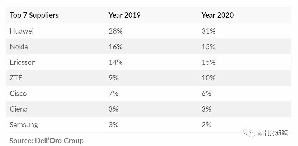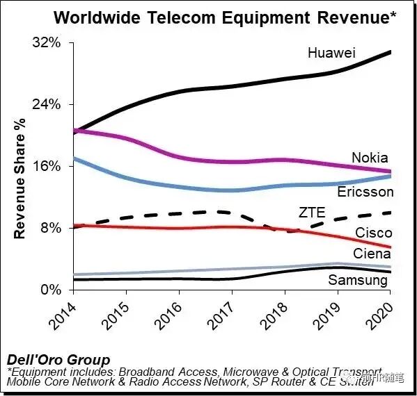 Dell'Oro发布报告称,华为去年的市场份额是31%,创历史新高。而三星、诺基亚和思科下跌。