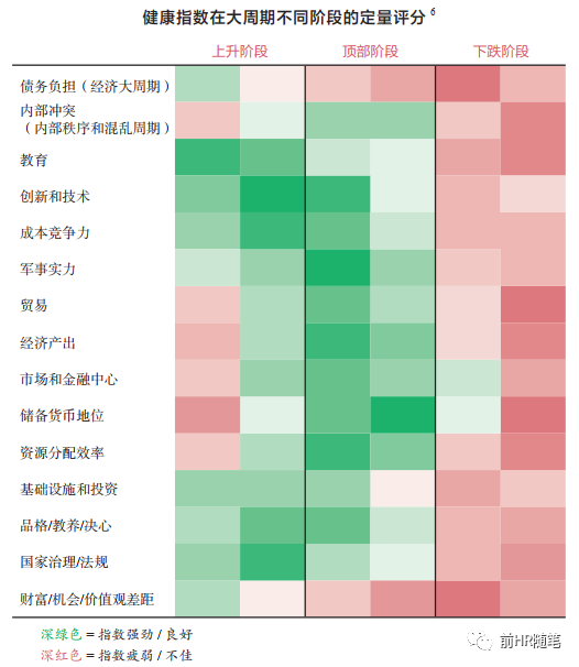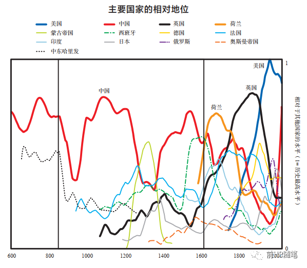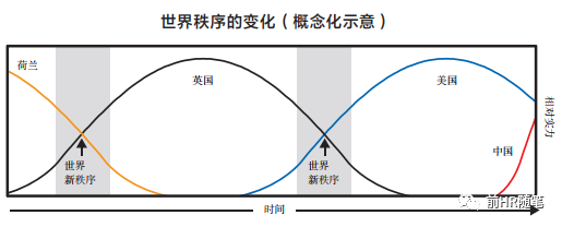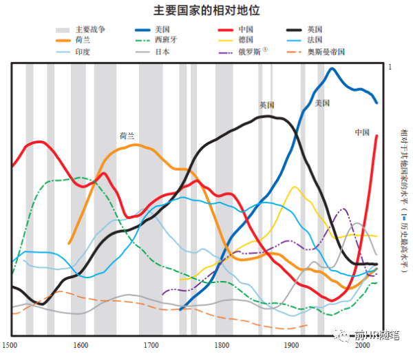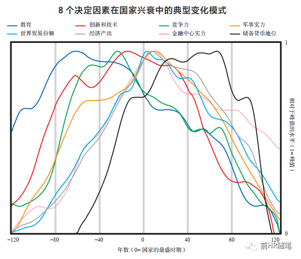 图2,他总结时间轴,教育的兴起在国家兴起之前,这个比国家综合实力要提先很多。教育起来后,就是创新,然后竞争力,国际贸易,经济GDP、军事、金融和储备货币,尤其储备货币有巨大的滞后性。