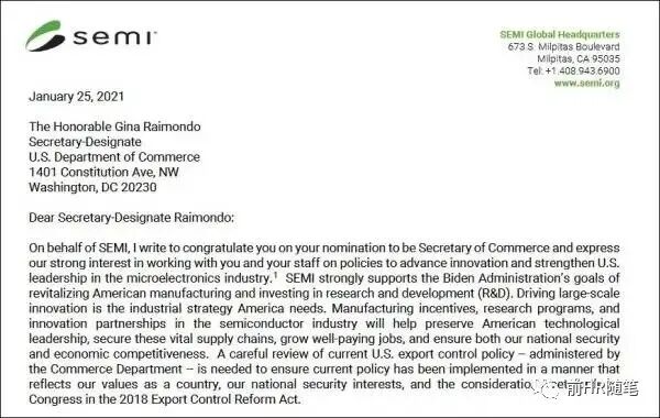 当地时间1月25日,总部位于美国的国际半导体产业协会(SEMI)向包括美国候任商务部长吉娜·雷蒙德(Gina Raimondo)在内多名高官写信,呼吁美国新当局审视床破时期政府的出口政策,对包括半导体制造设备和材料在内的物品进行“多边管制”,否则会反噬自身。