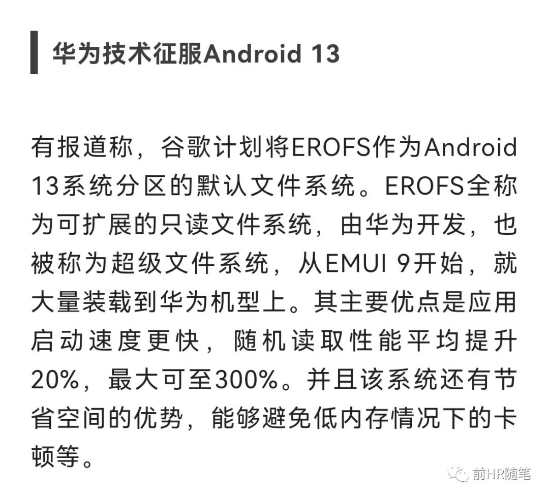 华为离开安卓后,安卓创新确实变慢了。看到新闻说谷歌要把华为发明的EROFS加入安卓13,这个感觉尤其明显,因为华为手机用很久了呀。