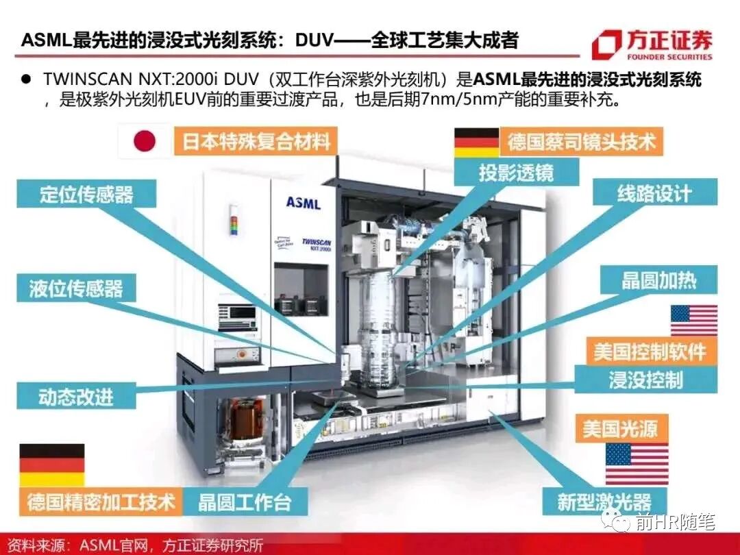 第四是设备平台的精度。ASML的EUV光刻机,刻出的芯片线路,线与线间的距离只有3纳米,相当于12个原子排成一排的宽度。这要求机械运动平台的平稳和高精度,才能保证光刻和刻蚀能够准确对准晶圆。这个精度解决,那可以解决目前任何工业的控制精度要求。