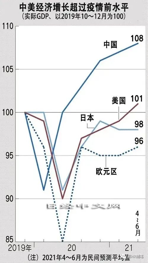 如图1,美国人这次放水后,利用美元的优势转嫁危机,相当于从其他国家抽血补美国。《日本经济新闻》5月19日报道称,预计在二季度,美国的GDP也将恢复到疫情前的水平。今年春季以来疫苗接种工作有所推进的欧洲,有望在二季度以后实现经济复苏。相比之下,日本面临着落后风险。
