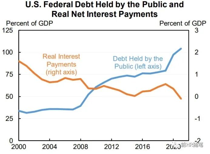 图4,美国人债务虽然上升,但是他们的利息负担是下降的,这样美国人完美的剪羊毛。