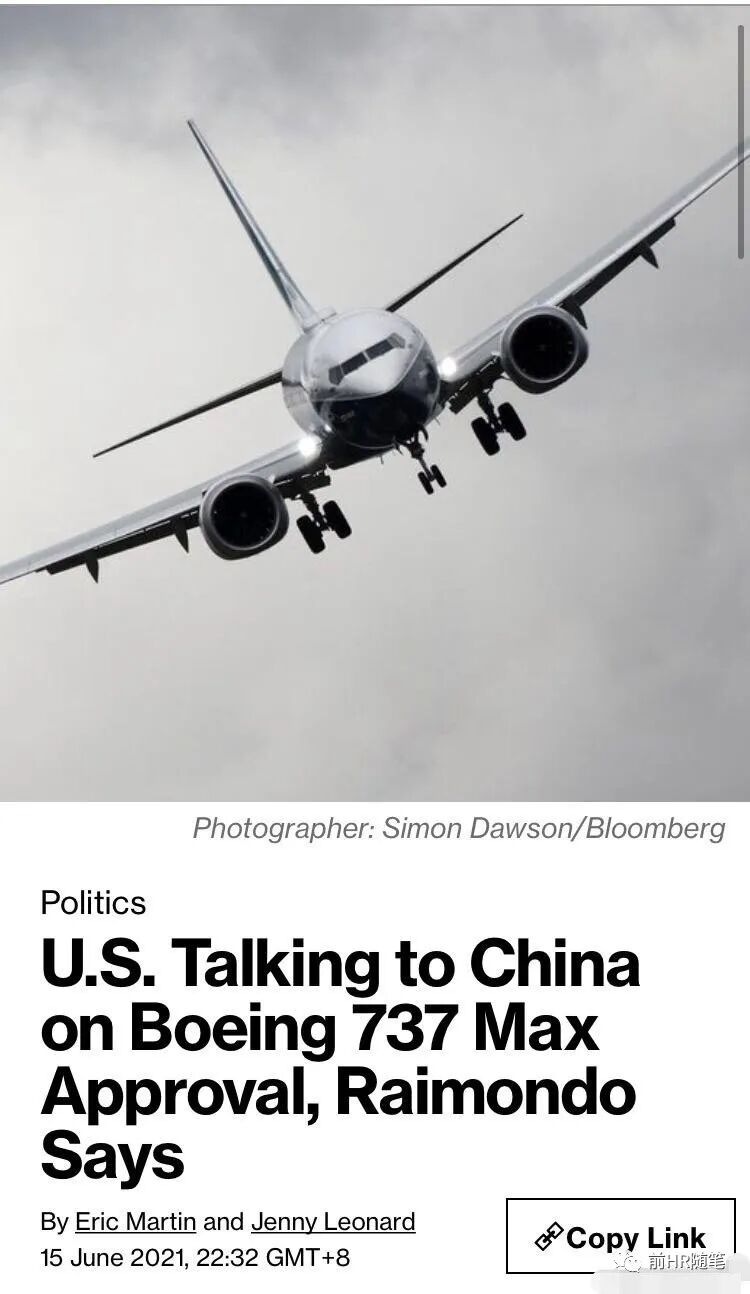 昨天外媒说美国商务部长雷蒙多表示,睡王政府正在与中国政府接触,争取波音737 Max获得中国监管当局批准复飞。她说:“中国是个大市场,我们必须确保美国企业可以在当地做生意并向中国出口”。