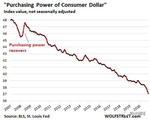 而更让美国人郁闷的是,通胀的情况导致这次美元购买力或面临永久性下跌,跌速为1982年以来最快。并可能永远不会反弹。