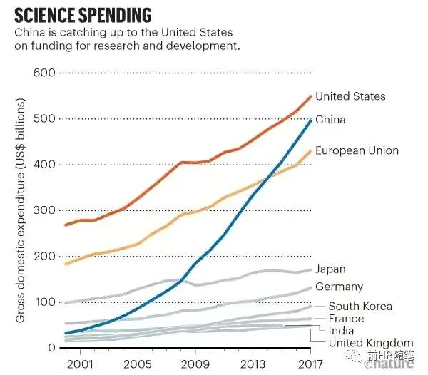 另一份报告也得出类似结论,美国国家科学基金会(NSF)收集的统计数据显示、并在《科学与工程指标报告》中指出,从2000年到2017年,美国的科研支出平均每年增长4.3%,但同期中国的支出每年增长超过17%。2017年,美国占全球2.2万亿美元研发支出的25%,中国占23%。其指出,2019年的初步数据表明,中国的科研支出已经超过美国。
