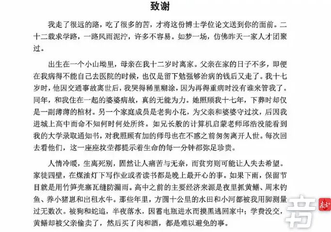 2021年4月,一篇博士论文的《致谢》在各大网络平台传播。