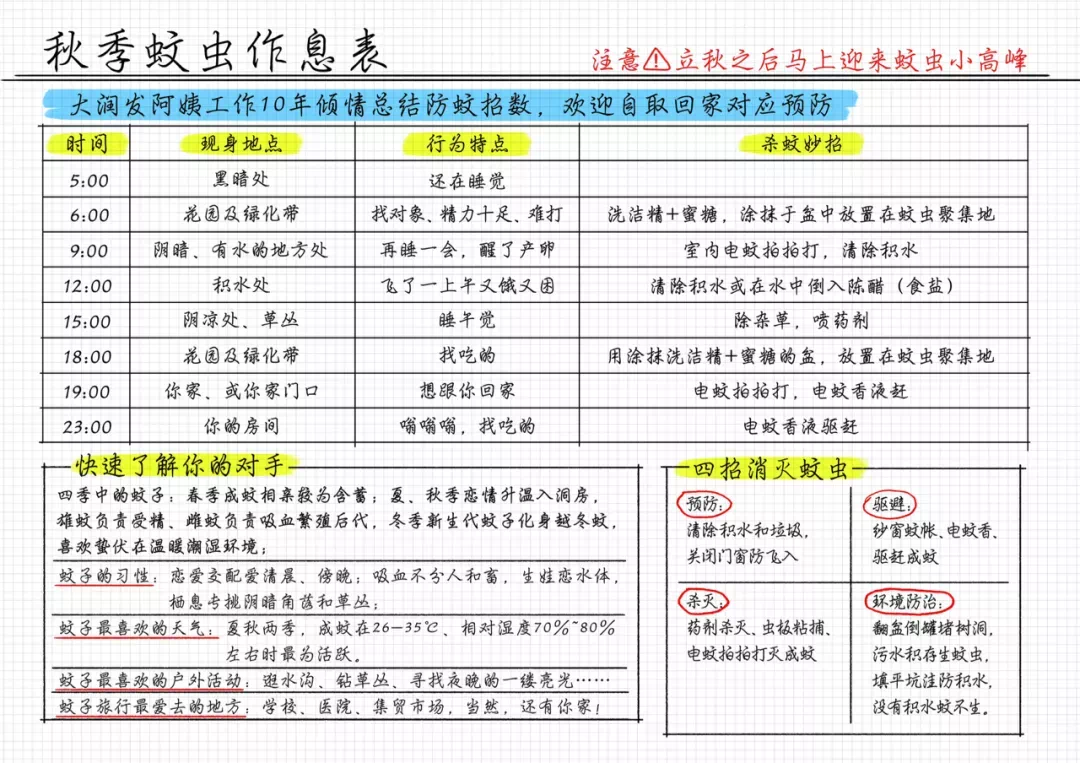 她还研究出一套“蚊子兵书”,一年不同季节,一天不同时间段,蚊子的生活习性、活动范围、灭杀招数,掌握得明明白白。