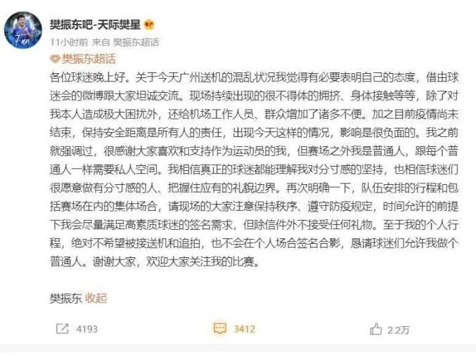 当天,樊振东通过球迷会的微博发声,称广州送机的混乱状况给他造成极大的困扰,也给机场工作人员、群众增加不便,“赛场之外我是普通人,跟每个普通人一样需要私人空间”,他言辞恳切地劝告球迷们把握应有的礼貌边界。