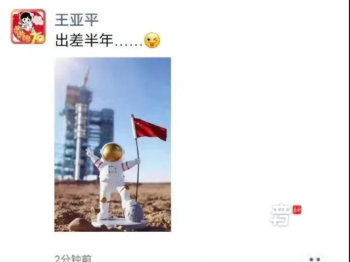 这次飞天前,出发前几个小时,王亚平发了一条略带调皮的朋友圈,她说:“出差半年”,并配了一张卡通航天员的图。