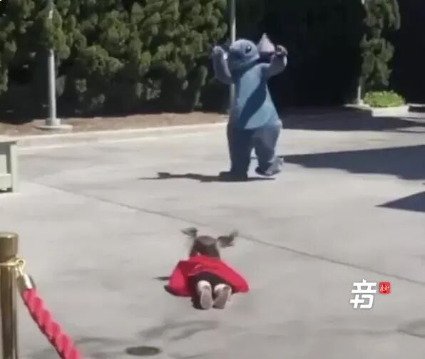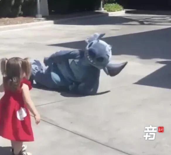 小女孩在乐园偶遇史迪仔,兴奋地往前冲时摔倒了。