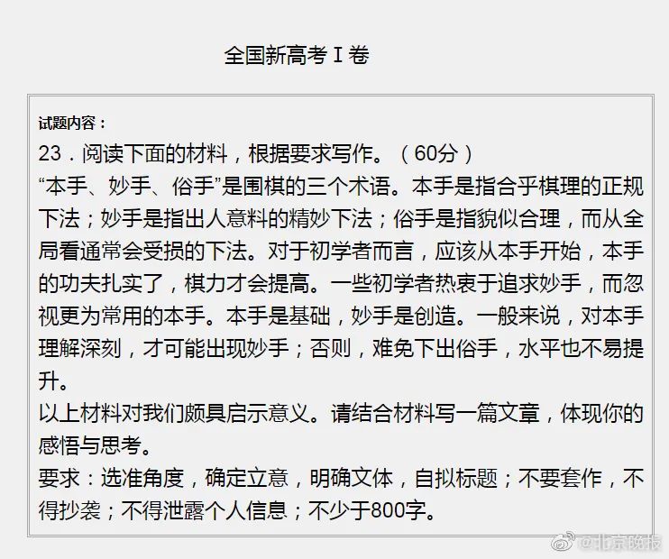 全国新高考Ⅰ卷的题目,是关于“本手、妙手、俗手”。 不知道大家如何理解?