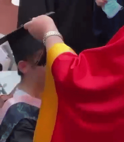 其中,有一位坐轮椅的毕业生,校长为他拨穗后,蹲下与他合影。