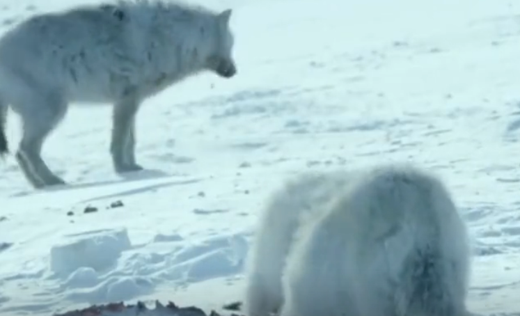 而就在两人感叹老狼的机智时,从洞穴里传来了几声狼叫,看来在这里躲避风雪的狼群都还活着,听到自己亲人的声音,老狼在洞外激动地回应。