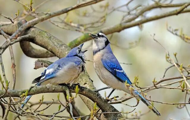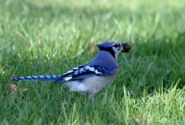 冠蓝鸦是个“杂食主义者”,动植物都有,比如浆果、花生、谷物、野草、小型无脊椎动物和部分肉类等等。