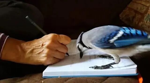 蒂娜写字的时候,它会飞过去在蒂娜写的字上啄几下;它会站在蒂娜丈夫结实的肩膀上,帮他“掏耳朵”;还会哄蒂娜的女儿玩耍,他们围着小花园追逐,笑声不断。