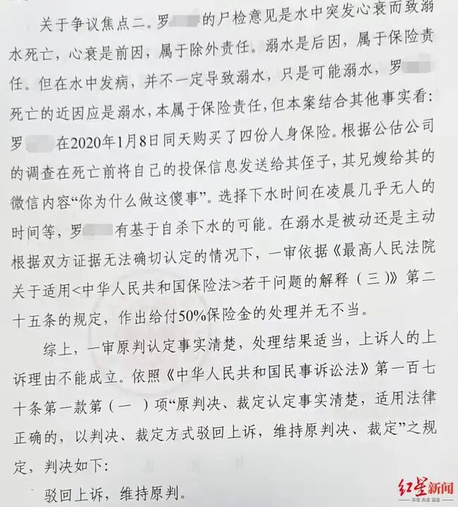 事后,罗某父母及保险公司均提起上诉。南充市中级人民法院审理认为,罗某尸检意见是水中突发心衰而致溺水死亡,心衰是前因,属于除外责任。溺水是后因,属于保险责任。但在水中发病,并不一定导致溺水,只是可能溺水,罗某死亡的近因应是溺水,本属于保险责任,但本案结合其他事实看:罗某在2020年1月8日同天购买了四份人身保险。死亡前将自己的投保信息发送给其侄子,其兄嫂给其的微信内容“你为什么做这傻事”,选择下水时间在凌晨几乎无人的时间等,罗某有基于自杀下水的可能。在溺水是被动还是主动根据双方证据无法确切认定的情况下,一审依据《最高人民法院关于适用<中华人民共和国保险法>若干问题的解释(三)》第二十五条的规定,作出给付50%保险金的处理并无不当。最终,南充市中级人民法院驳回上诉,维持原判。
