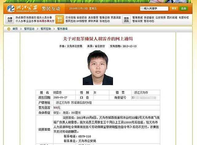 直到有一次,胡雷香在义乌担任了一个工厂的负责人,拖欠了11000元工资之后逃走,这一次她使用的是真实身份,因此被警方悬赏通缉,才导致了胡雷香后来在成都被认出身份后落网。