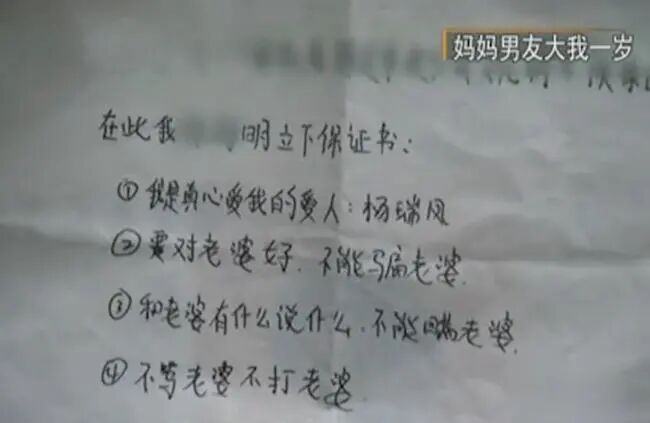 凑过去一看,原来母亲手中的纸上写的是陈小明对母亲的“爱情誓言”,都是“永远不打老婆,不骂老婆;对老婆好;永远不骗她;不主动抛弃老婆”之类的话。