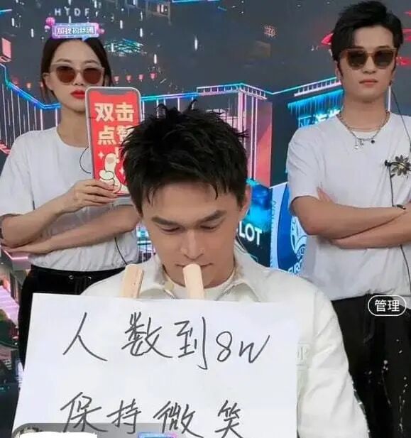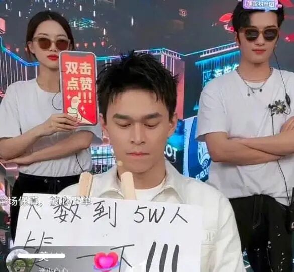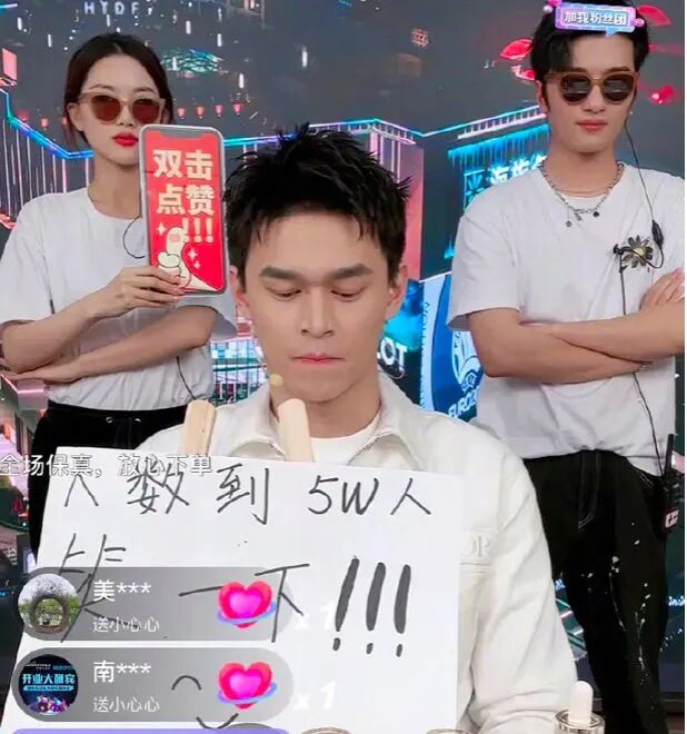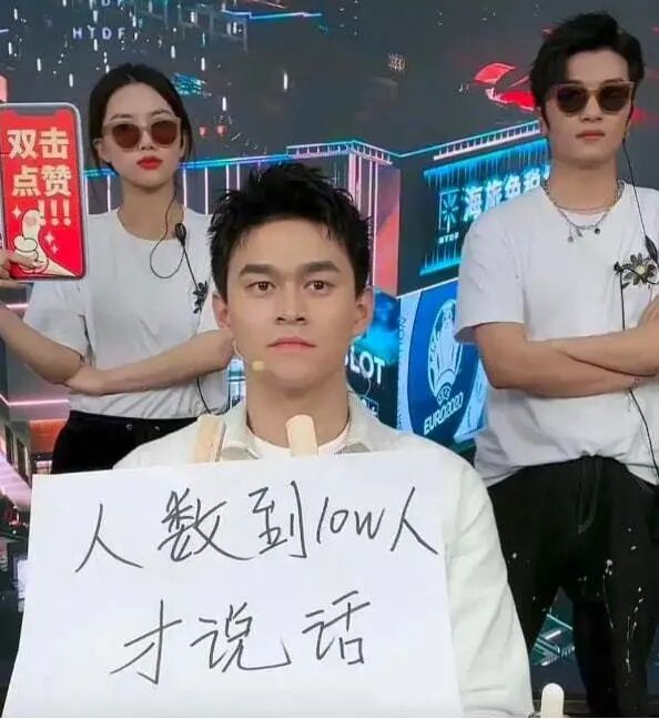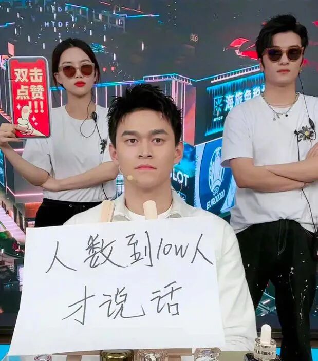 当天孙杨身穿白色衬衣,造型也专门打理过,他后面的背景写着沉浸式直播,也就是一直不说话,还站着好几位助理,不知道的还以为是保镖。直播一开始,孙杨便戴着墨镜,在白纸上写着,如果直播间人数到达3万,他就会把墨镜摘掉。