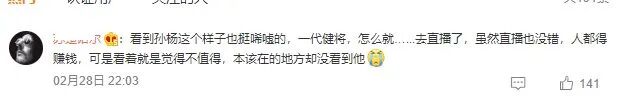 直播间人数突破10万后,孙杨才开始直播卖货,看到这番操作后,很多网友都表示不淡定了。有人称,看到孙杨这个样子,真替他可惜,之前可是一代健将啊,怎么跑去直播了,虽然每个人都要生活,但总感觉不值得。